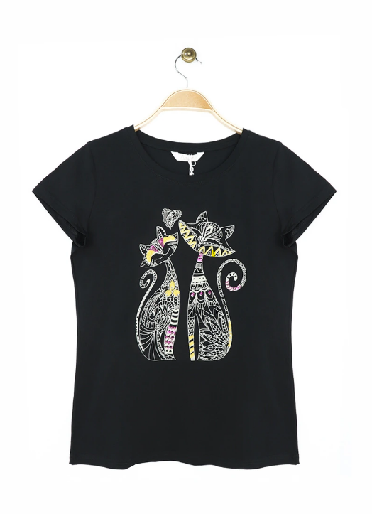 T-Shirt coton manche courte femme, imprimé chat mandala, noir.